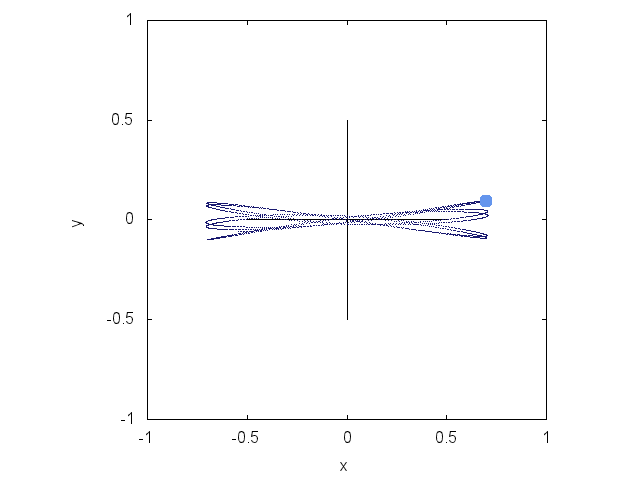 初期値を変えると、ボックス軌道と呼ばれる銀河中心の棒構造のような軌道を描きます。以下にこのアニメーションを示します。