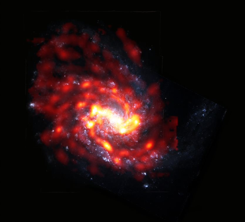 渦巻銀河NGC 4254は、おとめ座銀河団に含まれる銀河のひとつである。この画像は、アルマ望遠鏡が電波で観測した分子ガス(赤色/オレンジ色)と、ハッブル宇宙望遠鏡の光学データで撮影された星(白色/青色)の合成図である。