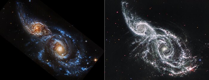 左の写真が、ハッブル宇宙望遠鏡によって捉えられた連銀河IC 2163・NGC 2207の写真。右側はジェームズ・ウエッブ宇宙望遠鏡によるもの。