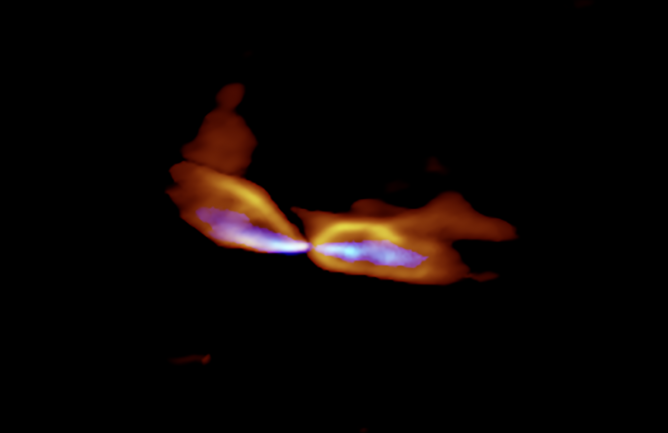 アルマ望遠鏡で観測した、原始星MMS5/OMC-3から噴き出すガス流の広がり。低速ガス流(アウトフロー)をオレンジ色、高速ガス流(ジェット)を青色で表現している。