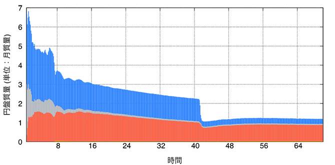 月の材料になる物質の質量及び起源の時間進化。各バーの色は図1のものと同義。